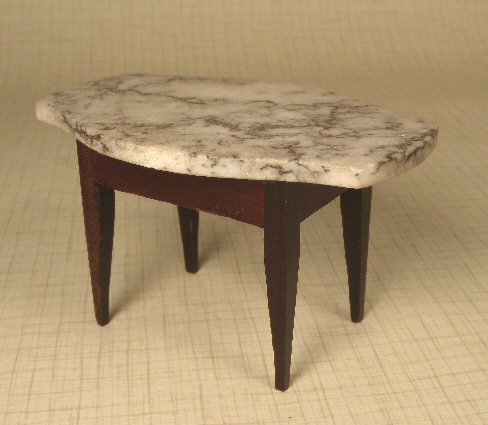 What a lovely marble top boulle table with great curvatures on the marble top, which is beautifully veined with light and dark grays. The 4 legs and skirts are dark finish with a beautiful gloss that boulle furniture is known for. Made in Germany, c. 1880's. Lovely condition. Height is 2 3/8", length is 3 7/8" and depth is 2 5/8".