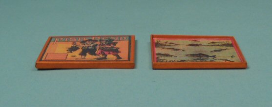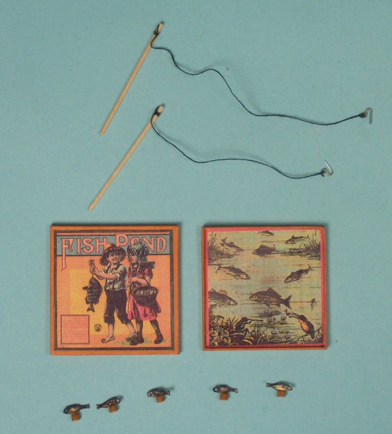 This is an incredible piece of workmanship by miniature artist, Renee Bowen c. 1970--everything is so tiny, it has to be seen in person to get the true feel of how precisely this Game of Fishpond was executed. The first photo shows the 2-part box together, the top fits perfectly over the bottom portion--dimensions are 1 1/2" x 1 1/2". The second photo illustrates how thin the sides of the 2-parts of the box are, a scant 1/16" deep on each box piece. The third photo shows each box side along with the playing pieces, 2 tiny fishing poles with hooks and miniscule fish that actually stand up on tiny bases so that the hook can be inserted into tiny little holes in each fish. Truely incredible. Each fish is 5/16" long and you really need a magnifying glass to see that each fish is detailed and that the hole for hooking is the eye of the fish. Colorful and bright, the cover pictures a boy and girl just coming from fishing--he is carrying the fish with a proud smile on his face and she is carrying a basket on her arm, and the base box's interior is the fishpond full of fish swimming in the water...the boxes are thin cardstock covered with imprinted paper. The fish are metal and look to be hand painted, with tiny wood bases to stand up. The fishing poles are wood with thin black cording for lines with metal hooks at the ends. All pieces are in excellent condition. I cannot find a signature, but this wonderful miniature game was part of a collection of Renee Bowen games and furniture (the other items are being sold separately). This would be great as a display piece in a game room, nursery or boy's room for a dollhouse or a scene.