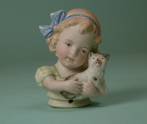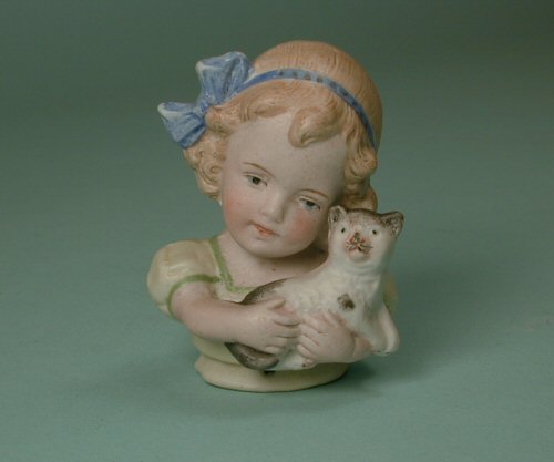 This darling little girl snuggling up to her cat is a pin cushion or half doll with 2 sew holes. She is exceedingly rare...very few half dolls were made with a child with her pet animal. She has her arms wrapped around him with her head tilted toward him very lovingly. This was made in Germany c. 1910 by the firm of Conte & Boehme. She has a blue head band with a large bow in her light brown hair with curls in the front framing her face. She has an open/closed mouth and her dress is yellow edged in green. Height is 2 1/2". Excellent condition with no breaks or repairs. No markings. Very rare item.