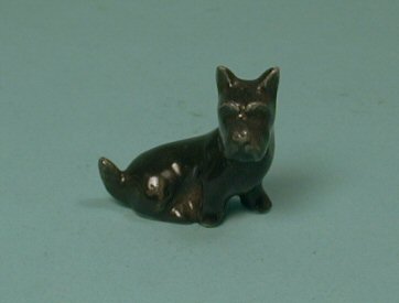 Darling little German-made black Scottie dog ideal for the 1" scale dollhouse. He is made from porcelain and marked Germany on the bottom. c. 1910-15 era. 1 1/8" high, 1 1/4" long. Splendid condition. Scotty is pictured with other dogs (each sold separately) and 1" scale living room chairs (not for sale) for size comparison.