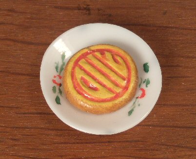 Very attractive cake decorated with yellow and red frosting on the top sitting on a lovely milk glass platter which has been hand painted with red flowers and green leaves. The diameter of the platter is 1 3/8". Beautifully made cake is a plaster type material and hand made and painted. German c. 1900. Beautiful condition. Pictured on a German dining room table, which is sold separately.