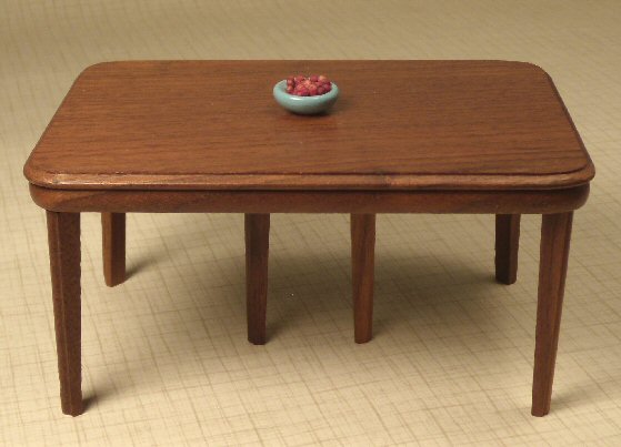 Nicely made small dish holding cranberries, by Dolly Dear, R.T. Kirkland during the 1940's. Dish is wood, enameled in a lovely blue color. Cranberries are nicely made from composition. Diameter is 5/8". Great condition. Pictured on a Strombecker table (sold separately) for size comparison.