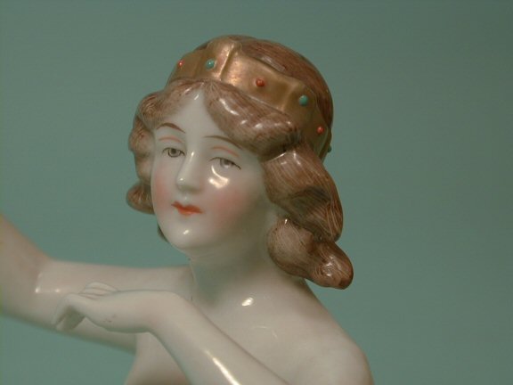 The lovely half doll pictured was produced by the Sitzendorf company in Germany c. 1910. Both arms are way up with the arm on the left side raised as high as her head--perhaps she is dancing. Her wonderful face is finely detailed and her flowing hair is as if the wind is blowing it from the front and flows out from her face--this is very unusual in a half doll. Her hair is light brown with extra lines painted in to denote hair strands. In her hair is a molded gold crown or band that has colorful jewels molded in. Her fingers are so delicate and nicely formed. This is truly a spectacular, very unusual half doll. She is marked on the back with the numbers 22675. This model is pictured in an original Sitzendorf catalog, listed under the same model number #22675. It is also pictured in the Encyclopedia of Half Dolls on page 218. Height is 3 1/2". She is in great condition with no breaks, repairs or hairlines.