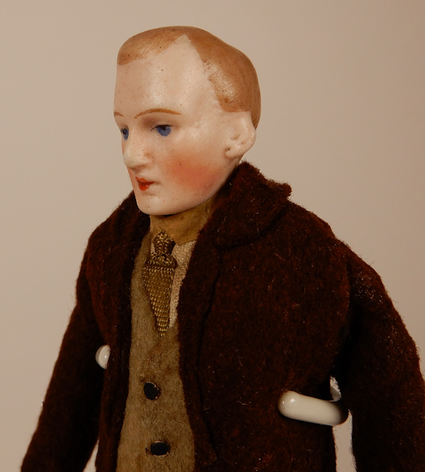 Handsome Kestner dollhouse gentleman wearing a brown felt suit, beige long vest with Dresden paper buttons, lovely light moss green tie with Dresden paper collar. Nicely executed character face hand painted blue eyes, pursed lips and light brown hair, brown molded short boots with a surprise of lavender stocks. Made in Germany by the renown firm of Kestner c. 1920. He stands 5 1/2" high, very nice condition with no breaks or repairs. The last photo shows him with his lady friend, who is sold separately.