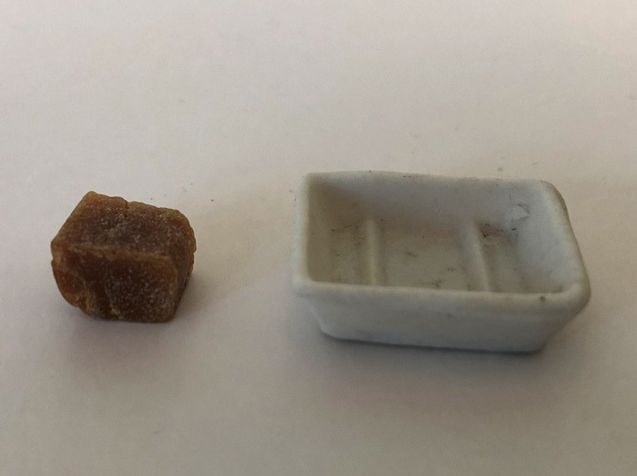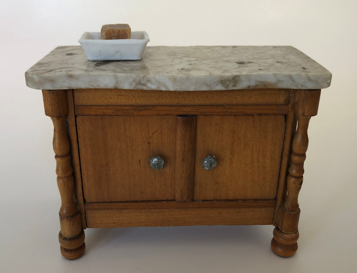This very early 1" scale soap dish with original hand-made and hand-cut soap is one of the hardest items to find for the dollhouse. c. 1880-90. The white porcelain soap dish has 2 raised protrusions to keep the soap from melting in dripping water, just like a real soap dish. The ealy soap is a light brown and unevenly cut, again just like the original early hand made soaps. Great for the early washstands which usually were in bedrooms, or for a bathroom or a kitchen. Size is: 5/8" wide, 7/8" long. Excellent condition. Made in Germany. Pictured on a 1" scale German Schneegas side board, which is sold separately.
