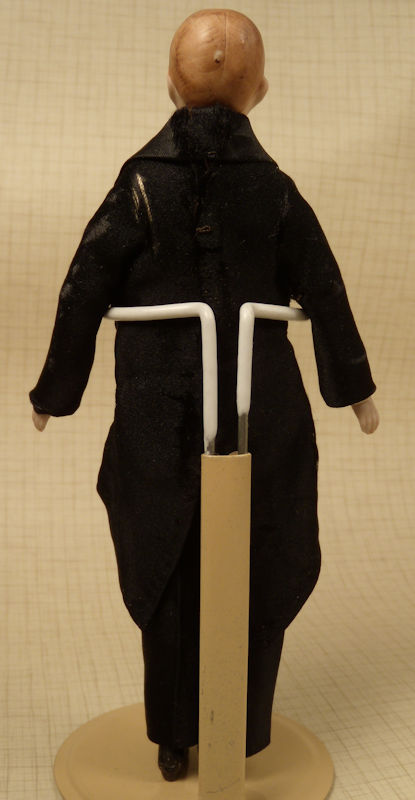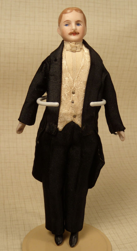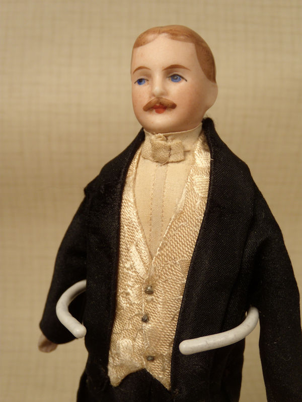 This is a wonderful dollhouse gentleman wearing a black silk tuxedo with long tails in the back with a brocade white silk vest (brocade has an in-woven design), white shirt and white bow tie. He has a wonderful character face with a molded mustache and painted features with blue eyes and light brown hair that matches the mustache. He is 7 1/8" high and is quite stately. He is in great condition with no breaks or repairs. The silk on the back of his jacket has a little bit of melting, but the majority of this is on the back side. He has black molded boots and bisque hands.