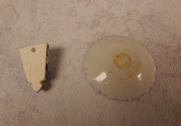 Two interesting porcelain pieces artist made and signed on the backs which are shown. The blue and white porcelain plate has a design of an American clipper ship which boasts a very tiny American flag at the top; the back of the plate is marked: M in a circle; the plate is 1" scale at 1" diameter, and has a lovely scalloped edging. The tiny open top porcelain hanger has a design of a lovely Chinese garden with a lady standing on a small bridge; it has a pin hole in the back so that it can be hung on a wall; 1 inch scale, tiny at only 3/4" high; maked on the back with the initials: LC in script. I believe these were made in the 1980's. Both in great condition.