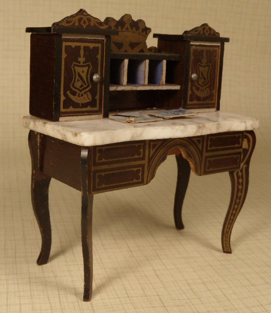 Beautifully made dollhouse boulle desk with the rare feature of a marble writing surface by the reknown German firm of J. D. Kestner. Beautiful dark finish with gold gilt accents, crown in the middle and shields on the two doors which open and other additional gold gilt decorations on skirt and legs. Cubbies in the center portion to hold paperwork. Comes with 2 original lovely blue envelopes, both of which are cut and decorated just like a real envelope, one of which has writing on the front and the other front is blank; envelopes are a scant 1/4" by 1/2". Made during the 2nd half of the 1800's. Height is 4 1/2" at highest point and 4" wide. Lovely condition, showing slight wear. Also pictured with a 6" tall dollhouse grandfather to show how nicely they look together;grandfather is sold separately.