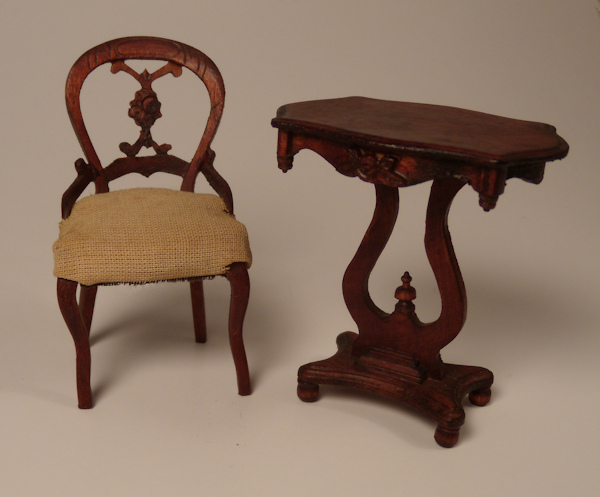 Pictured is Carl Forslund's Cherry Lee Occasional Table made by Hilleary House for Carl Forslund. These Forslund pieces were made only for a short time during the early 1940's and are hard to find. Made from cherry wood with a lovely finish, this piece has much detailing as can be seen in the photos. There is a flower carved on the front skirt and lots of curvatures and detailing all around. Just a lovely and fine quality piece. Height is 2 5/8". Great condition with no breaks or repairs. Also pictured with a Mary Belle Lee Chair which is sold separately. Another photo illustrates what can be done with a grouping of Forslund furniture decorated with potted flowers and set by themselves or in a Forslund shadow box. All items are sold separately.