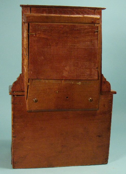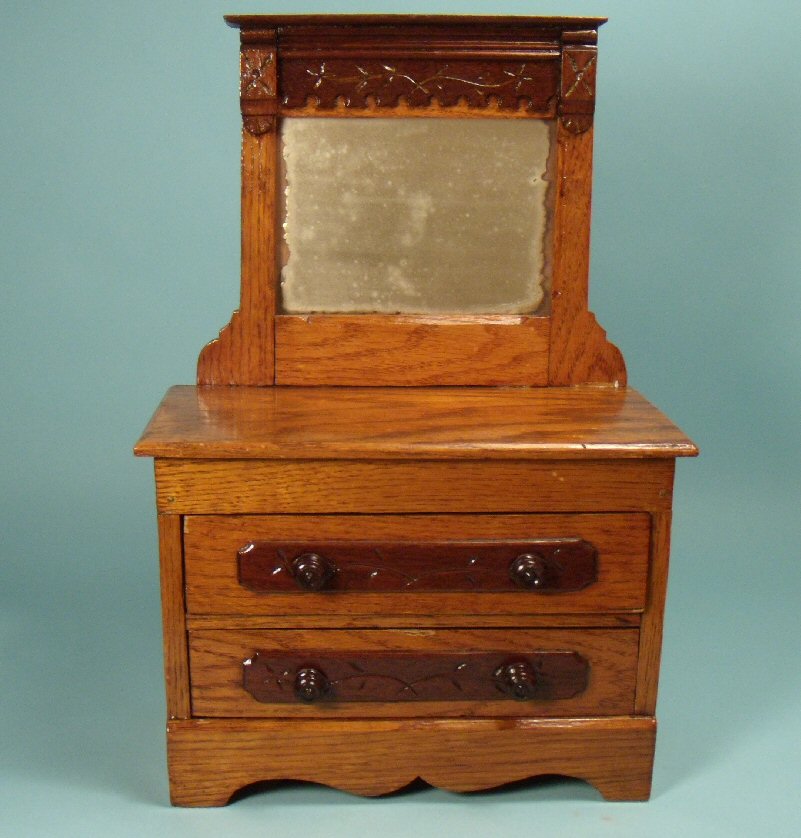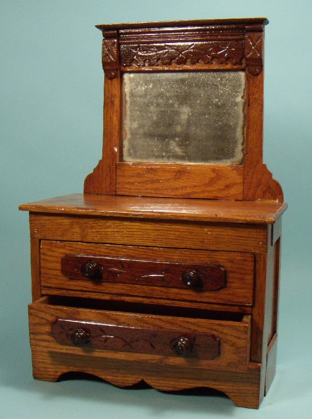 What a great looking American oak doll's dresser, c. 1885, a true Americana. Beautifully made with portions in light stain and contrasting darker stain on the panels of the drawers and wooden knobs and also at the top portion of the mirror. These darker stained wooden overlays have been hand-carved beautifully with additional detailing and also with a vine, leaf and floral designs. The mirror is original and it is backed with a wood panel. Made with extra care and pictured with an early china head doll which is 13" high for size comparison (doll is sold separately). This dresser looks just like the real furniture so popular at the time. Height to the top of the mirror frame is 13", width is 8 3/4" and depth is 4 1/2". Lovely condition with great early patina. I cannot find any markings. One photo shows the bottom drawer open and a small portion of the sides which have extra detailing. The last photo also shows lovely accessories on the dresser for size comparison; each item is sold separately.