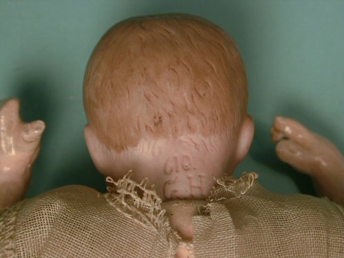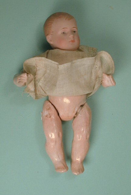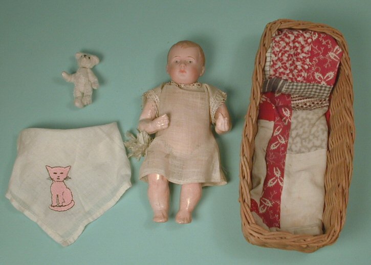 Splendid little bisque head boy baby doll with a wonderful character face. Blue intaglio dreamy eyes, almost like he is just about to fall asleep with his little teddy bear. He is tucked into a basket bed that has an antique quilt underneath for his bedding and a little cover that has a pink kitty cat hand embroidered onto the front. This darling little boy doll has a fully jointed compostion body in fabulous condition. His head is marked 610 G.H.--my Cieslik's Doll Marks Book tells me that this doll was made by Gustave Heubach in Steinbach, Germany. c. 1910. Doll is in great condition with no breaks, hairlines or repairs. Hair is molded a light brown with lots of brush marks. He wears his original chemise. The little cover with the kitty cat is actually an antique cream-colored hanky. The white little fully-jointed teddy bear is not old, but I believe it is artist made with little black bead eyes, hand embroidered nose and mouth and written on the foot, Missing You. The doll is 6 1/2" high and the overall size of the basket bed is 7 1/2". All in great condition.