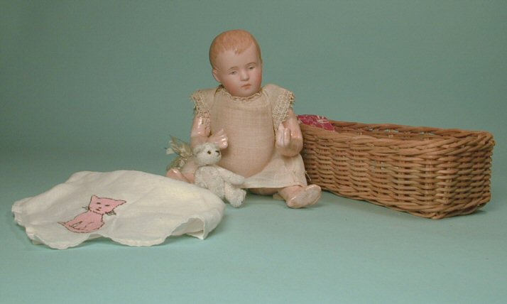 Gustav Heubach Character Boy Baby in Basket/Bed w/Toy Bear #184-20