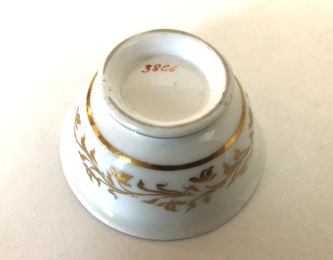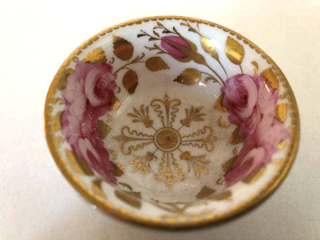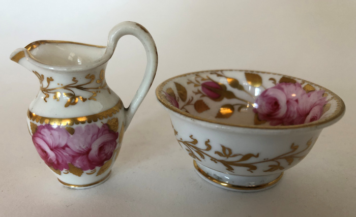 Lovely, very early French Old Paris porcelain fashion doll accessory consisting of a matching bowl and pitcher for the fashion lady's dresser and toilet. Beautifully hand painted with pink roses and rosebuds and gold stems, leaves and other designs. The bowl is decorated inside and outside. The pitcher has a high handle and beautifully shaped lip accented in gold. This is one of the most beautiful doll accessories I have had in many years and stands out as an excellent accessory. Diameter of bowl is 2 1/4" and height of pitcher is 2". Superbly done and in beautiful condition with no breaks or hairlines. The bowl is marked underneath with red numbers as shown in the last photo. c. 1870