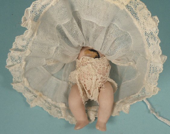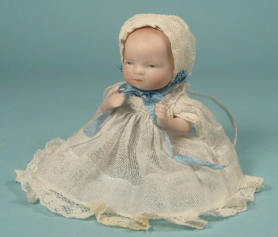 What a sweet little all bisque Bye Lo baby made by the German firm of Kestner. She is 4" high and is jointed at the arms and legs. Her darling face is all hand painted and the execution of her features is wonderful. She is fully marked on her back, numbers and Copyright by Grace Putnam, and she has a partial paper label on her chest as shown in the photo. Her darling dress is very pale light blue which is accented by a darker blue ribbon and rosettes on her darling little off-white hat. Dress and hat also trimmed with early lace. Her hands are in the typical Kestner fashion, one hand up and somewhat open while the other hand is more turned inwards. Beautiful condition with no breaks or repairs. Clothing shows some aging but very beautiful. She also wears lacy undies. She can be posed sitting or laying down.