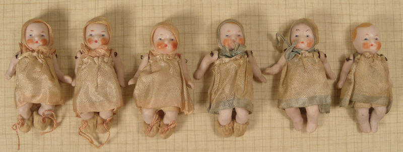 Sweet faced Hertwig Co. baby made in Germany c. 1915 with jointed arms and legs, wearing her original factory dress and matching bonnet which are cream color and edged in blue. She also wears her original factory felt booties and undies. All bisque with hand painted facial features and blond hair. Great condition with no breaks or repairs. 2 1/2" high. She is pictured with her sisters, 3rd doll on the right hand side--each doll is sold separately.