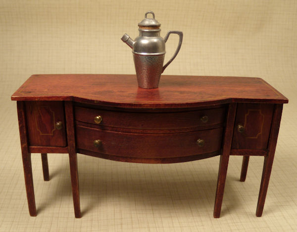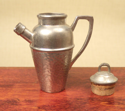 Great looking water pitcher with separate cover that has a cork. Made by Gerlach and this was an accessory sold by the firm of Tynietoy. Silver color metal with nicely shaped handle. 1 7/8" high. Pictured on a Tynietoy sideboard, which is sold separately. Nice condition. Marked Germany on the bottom. Cover is slightly up because of cork.