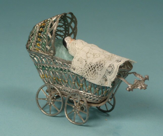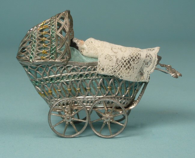 Darling dollhouse size carriage made by the German firm of Babette Schweizer c. 1900. The carriage is soft metal, delicate and beautifully made with extra detailing including the original colors on the metal filigree of acqua blue and gold. The bedding is very lovely and consists of a "mattress" made from kapok covered with old silk, the same acqua blue as the coloring on the carriage. The outer blanket is made from beautiful antique lace and pinned to the sides to hold the "baby" in. The "baby" is an early frozen Charlotte who wears a gown made from early lace. The whole package is very charming and beautiful. Frozen Charlotte is approximately 1 1/4" long. The carriage is approximately 3 1/2" long and 2 1/2" high. All in beautiful condition. I found a picture of this same carriage in a book showing an early advertisement by Babette Schweitzer illustrating this carriage with their identification number as #603.