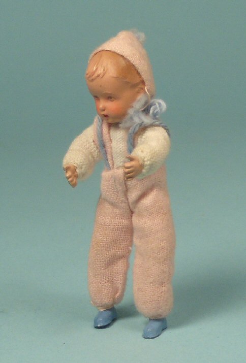 Darling little Caco child who wears her original pink overalls with matching hat, both trimmed with blue--there is a blue pom-pom at the tip of her hat. She has a white long sleeved shirt. Hands and shoes are metal, indicating that this is one of the earlier Caco dollhouse dolls. Head is a celluloid-type material, with molded hair and hand painted features. c. 1950, Made in Germany. Height is 3 1/4". Very nice condition. Darling little face.