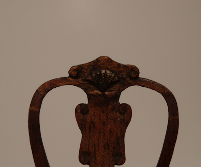Beautifully made artist chairs with upholstered seats in a lovely deep pink or mauve brocade. The pattern on the upholstery is perfectly matched up on both chairs so that the oval shaped pattern is in the middle of the seat. Hand carved ball and claw feet and at the "knees"; also lots of hand carving at the curved back rest with scrolls and shell design--this is so hard to do on miniature wooden items. I have attempted so illustrate the carvings and the curvatures of the fiddle-back back rest. Mahogany color wood with so many lovely features, it is difficult to describe all of them. 1" scale. 3 1/2" high. Made in the 1970's or 1980's. Underneath is lined with black fabric. Unknown artist as I cannot find any signature. This set came out of my personal collection.