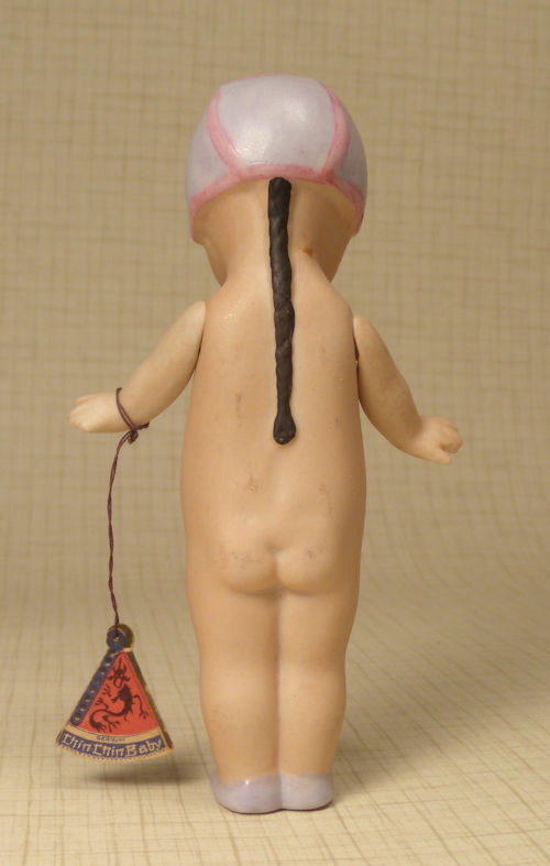 Chin Chin is a great character doll made by the German firm of Gr. Heubach. He still has his original wrist tag attached. Molded facial features and this one has a very pouty mouth. Lavender and pink hat with matching lavender shoes. He has a long queue in the back. Nice detailing on his body. Jointed at the arms. Can stand by himself. c. 1915. Great condition with no breaks, repairs or hairlines.