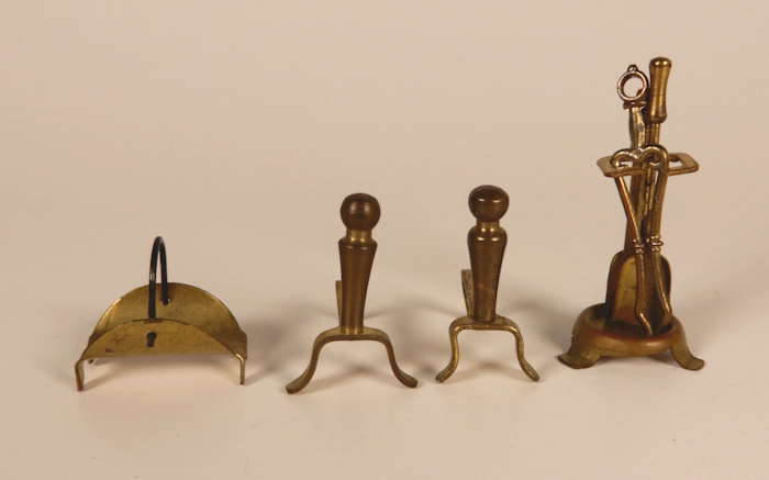 Nice looking early all brass fireplace equipment that contains 6 matching pieces in a 3/4" scale. The set contain 2 log holders, a log basket with black sturdy wire handle, and utensil holder with a shovel and tongs. Great early patina, every piece in nice condition. It is difficult to find such a large, matching set. I have not polished this set as I feel the early patina is great. Utensil holder is 1 1/2" high. The log holders are 1 1/16" high and 1" deep.