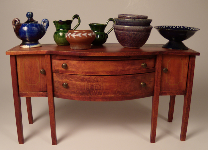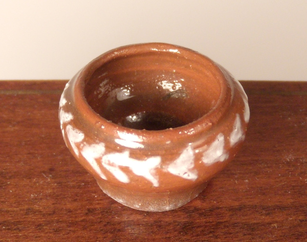 This splendid redware miniature bowl has it all--gorgeous form and a raised white slip arrowheads decoration that goes all around. Great American made redware in miniature and so hard to find. The glazing is a lovely reddish brown. It is completely glazed on the interior. The redware showing on the bottom is pictured. Great Americana and perfect for the early dollhouse collector and collector of American redware. Height is 3/4" and diameter is just about 1". Great condition. Also pictured on a Tynietoy sideboard with a large group of redware and pottery.