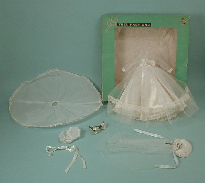 What a fantastic bridal outfit for Jill still in the original box. It consists of a full, luxurious long white gown made from satin layered with netting trimmed with lace. It has a straw hat trimmed with white flowers and satin ribbon with a long veil. The slip is long and full and is made from crispy nylon; the panties match the slip. Also included are two bouquets of flowers with a white satin tibbon to hold flowers together. The original tissue is still in the box. This wonderful outfit has been in its box all these years and has never been used. Fantastic condition. Nice large box with large cellophane window for viewing.
