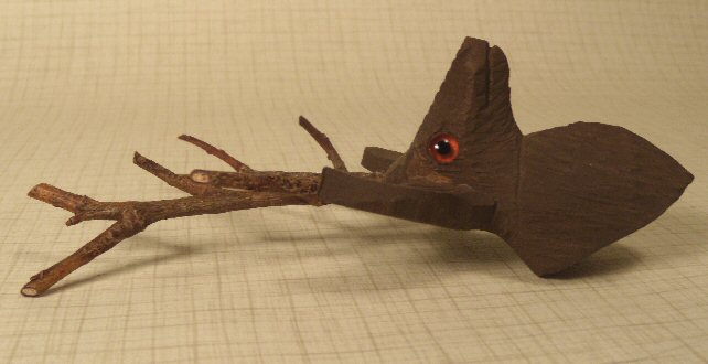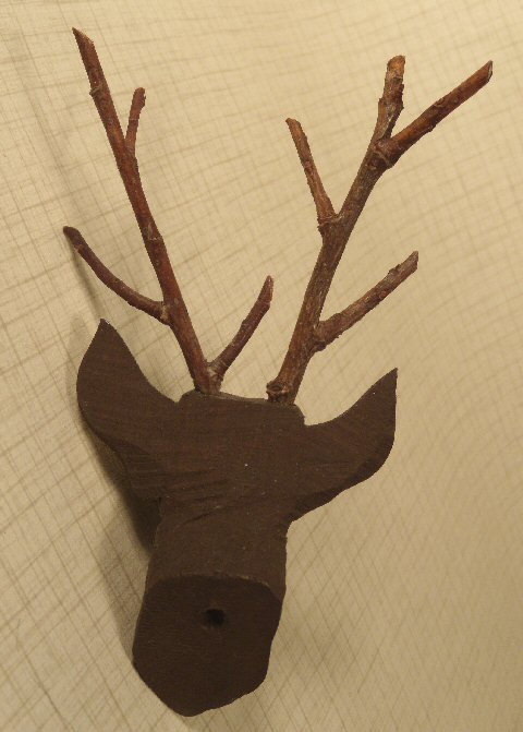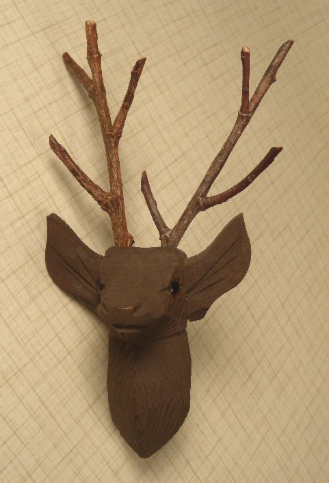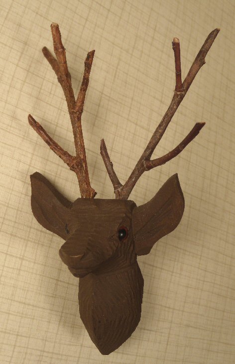 Extremely rare miniature hand carved from wood miniature stag head trophy ready to be hung on the wall of an early dollhouse. Beautifully carved, one can see the "fur" of the stag all the way around, head beautifully done and so realistic, inset glass eyes, enameled in dark matte brown. Made in Germany from the Black Forrest area by an extremely talented wood carver. Large prominent ears, antlers are cleverly made from natural branches. Back of neck area is flat with hole, ready for hanging. Size of head without the antlers is 2 1/2"; overall height with antlers is 5". This would be great in any number of rooms of a dollhouse--living room, trophy room, gentleman's room, playroom.