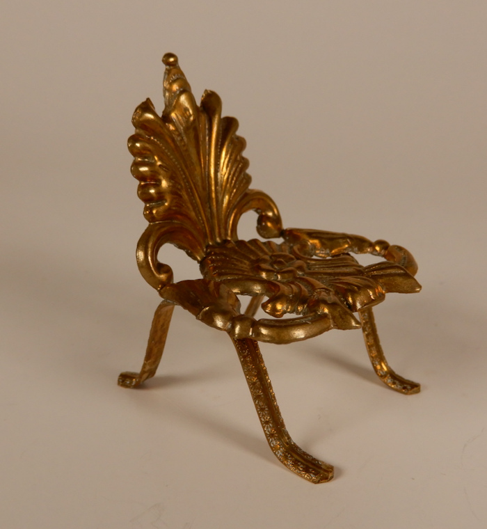 This small ormolu chair is meant for a dollhouse child, in a nursery or other room where a child or toddler doll can sit. Very ornate with lovely designs on the back rests or top of seat, scrolls and flower and interesting leg design. Height of back of the chair is 2" and width of seat is 1 3/8". Nice condition with no breaks or repairs; shows aging. This was made by the German firm of Erhardt and Sohne c. 1910-20 period. These lovely little chairs are difficult to find and would suit a darling little dollhouse toddler.
