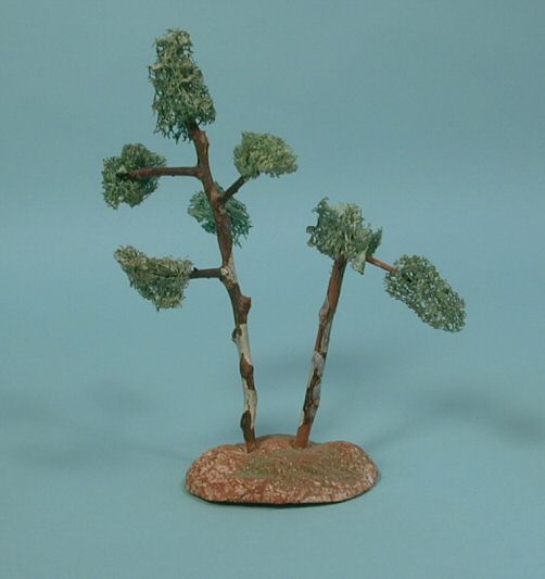 This beautifully made tree grouping was produced in Germany c. 1900. The base is made from formed plaster and painted to represent ground with a little bit of greenery. The trees are made from natural wood branches with natural loofah painted green to represent the green of the trees. It is marked Germany on the bottom. 6" high x 5" wide at wides point. This is a wonderful item in good condition but is very fragile and care must be taken when handling.