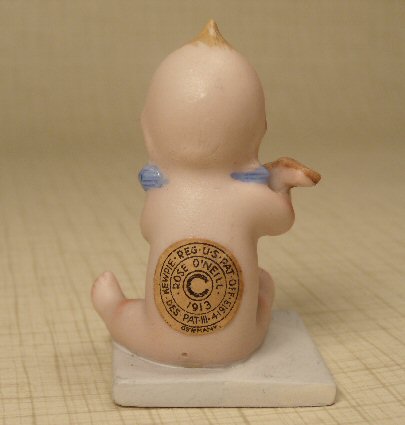 What a darling little Kewpie sitting and playing the mandolin. Made from high quality bisque in Germany in 1913. Sweet little expression with eyes looking to the side. He sits on a white bisque base molded with his body. Mandolin is light brown with prominent strings. 2 1/4" high. Paper label on back is marked: Kewpie, Rose O'Neill, 1913, Germany and other pertinent copyright information. Beautiful condition with no breaks or repairs. The steam release tiny opening, part of the manufacturing process, can be see at his bottom on the picture showing the back.