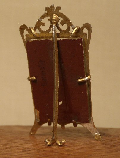 Beautifully made free standing gold gilt mirror intricating and delicating wrought framwork with a delicate brace on the back for it to stand. Pictured front and back and also shown on a lovely oak table (table sold separately). Marked Germany on the back. Lovely condition, mirror has a small spot where the silvering on the back is off. Rare and extremely beautiful. c. 1900-10 period.