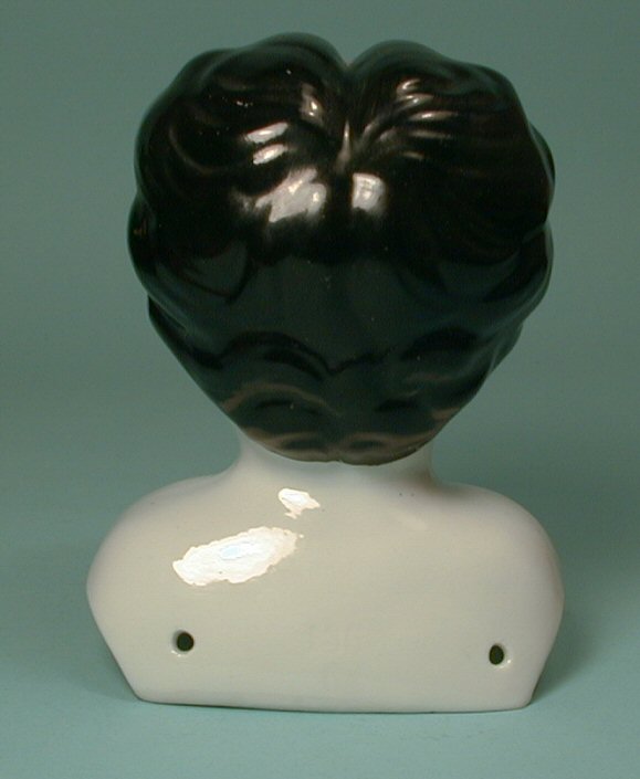 What a wonderful, large-size china head (head only) made by the German firm of Hertwig c. 1880. This splendid large size head makes a doll around 18" or 19" high....needs an early cloth or leather body. Very well made, she has great detailing and hand painted features--pale blue eyes, with red and black outlining on the upper lids and a well-formed small mouth and prnounced chin. The black hair has a very deep center part with good detailing of curls and waves....ears are partially exposed. Incised on the back 136/6 which can vaguely be seen in the photo. Overall height of head is 4 3/4", from inside shoulder to shoulder is 3 3/4". There is a small, very faint hairline on the front of the bottom of the shoulderplate about 1" long--it is faint and doesn't even show up on the photo. The rest of the china head is beautiful. This is great for displaying on it's own on a shelf, or for someone who has an old body or can make a body. These early large German china heads are getting harder and harder to find.