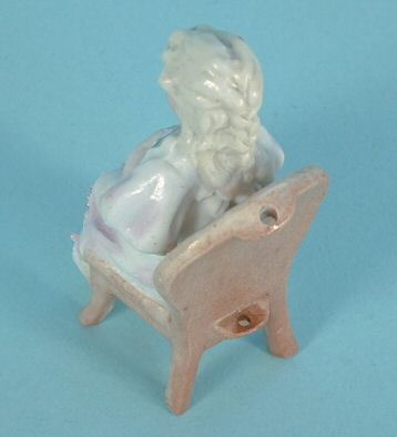 This diminutive young girl sitting in a chair is made from high quality German bisque. She has a wonderful hair style in the back consisting of a braid and curls which can be seen in the second photo. She is 2 3/4" high. Her molded chair has two molded holes in the back as shown. This item was produced c. 1910.