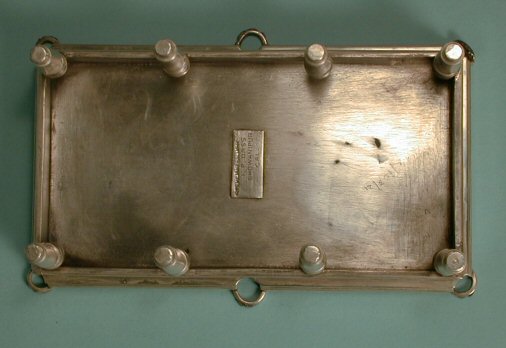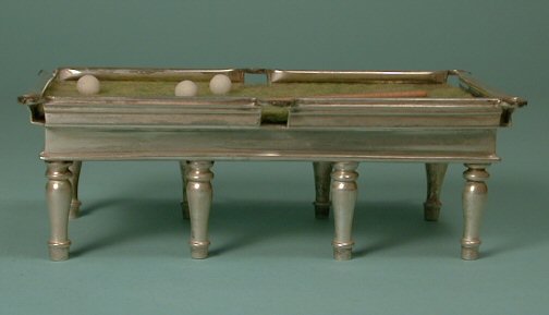 This is the first time I have ever seen a sterling silver billiard or pool table in all the years I have been in business. It is a wonderfully made piece with an early green felt surface (which is removable) with an attached cue and 3 billiard balls. There are 8 chunky legs. 4 3/4" long, 2 3/4" wide and 1 5/8" high. A silver label on the bottom says: " Sterling Silver, K. P. Dass, Bhawanipur Cal." K.P. Dass was an prominent, early silver smith in India. I belieive Cal. is Calcutta. Weight is quite substantial on this piece--my scale says slightly over 7 ounces. Green felt shows aging. I believe this piece was made in the early 1900's.