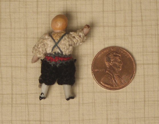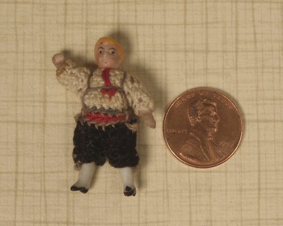 Darling tiny dollhouse boy made in Germany by the firm of Carl Horn, c. 1910. He wears his original crocheted outfit with knickers and tie. All bisque with jointed arms and legs, features are painted. This would be so adorable in a tiny dollhouse or as a doll for a dollhouse girl or in a nursery. He is 1 7/8" high. Also pictured with a Carl Horn girl (sold separately) for size comparison. Great condition with no breaks or repairs.