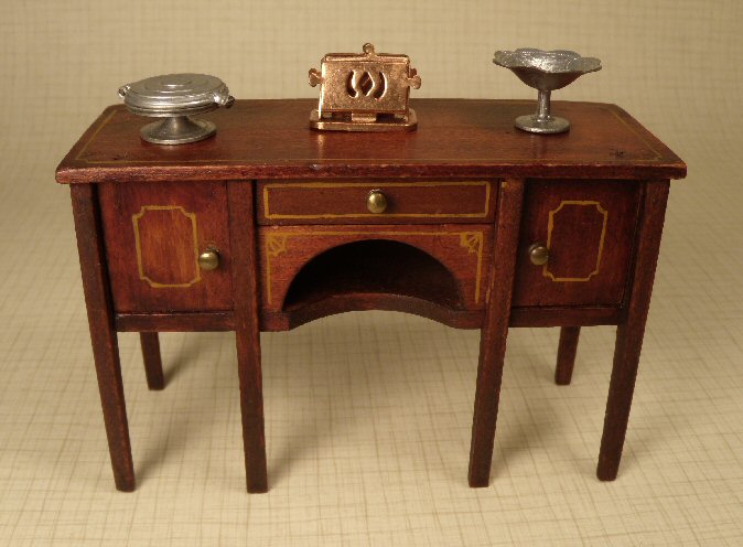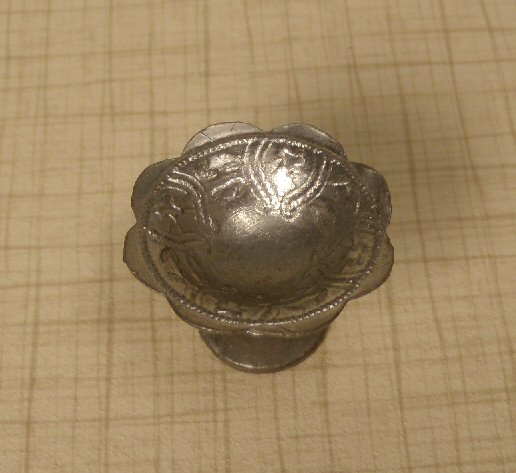 Very pretty metal pedestal fruit bowl made by Gerlach in Germany and sold through the Tynietoy catalogs, 1920's. Lovely impressed floral design on the top with scalloped edges. 9/16" high, great condition, no markings. Pictured on a Tynietoy buffet with other accessories for size comparison--all items sold separately.