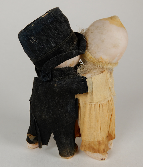 Very darling Kewpie Huggers Bride and Groom, by Rose O'Neill, all one piece molded together, made in Germany, most likely by Kestner. All original crepe paper and silk ribbon clothing, groom wears a splendid black crepe paper tuxedo with top had and his shy little bride whose head looks the other way has cream crepe paper dress, silk ribbons and a waxy bouquet. Very darling and all original. There are no breaks or repairs on the dolls, but since this was a cake topper on a wedding cake, there are still remnants of frosting mostly on the feet of this darling pair. The crepe paper clothing is very fragile and I did not want to do too much cleaning for fear of damaging the wonderful, original crepe paper clothing. 3 1/2" high. These all original Kewpie bride and groom cake toppers are becoming harder and harder to fine.