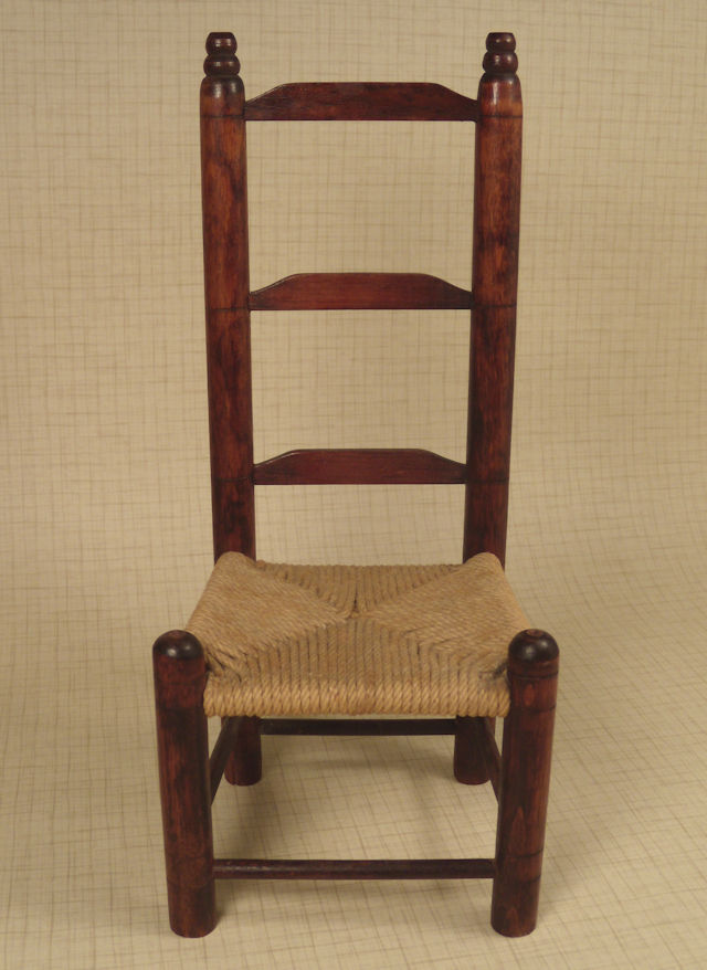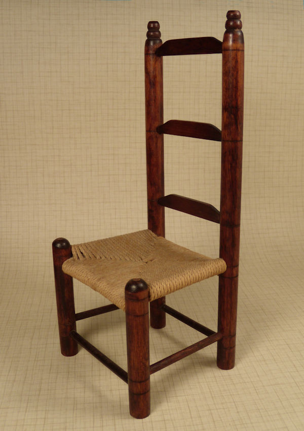 Oh so rare and wonderful Americana, early ladderback chair made in Hingham, Massachusetts, by one of the foremost Hingham craftsmen, Loring Hersey Cushing. And best of all, Loring Cushing's original label is on the bottom of the chair including his address in Hingham. Working during the turn of the century (1900) when Hingham's Arts and Crafts Society was formed, of which he was a member, he had his own workshop at his home creating splendid doll's furniture and this is one of his rare examples. The chair is 9" high, 3 1/4" deep. The rope seating his hand done and the finish of the wood is dark mahogany. Condition is wonderful. If you check my page listed at the top left entitled Articles and News from The Doll Works, you will see a list of articles I had written over 6 years ago for Antique Doll Collector Magazine including a 3-part article of the Hingham Craftsmen one of which featured Loring Hersey Cushing. Examples of this type of chair were illustrated in my article. After my research and articles about the Hingham Craftsmen were published, there was an intensified increase in the interest of collectors about the work of the Hingham Craftsmen. About 2 years ago, the Hingham Craftsmen, including Loring H. Cushing, were featured in an exciting exhibit at Old Sturbridge Village in conjunction with the release of the well-received book, Bucket Town by Derin Bray fully documenting a large number of Hingham Craftsmen--Loring Cushing's work is discussed and illustrated on page 131. Some of our Hingham pieces were featured in both the exhibit and the book. This chair is the perfect size for a cabinet-sized doll or a larger scale dollhouse.