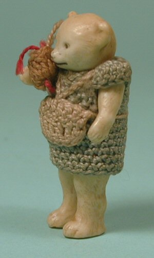 Rarest of the rare!!! All bisque teddy bear with jointed arms and legs with original crocheted clothing consisting of a sweet little dress and apron. She is holding crocheted basket. 2" high and made in Germany c. 1910-15, these darling little humanized bear dolls are highly coveted by collectors and are extremely scarce. Wonderful little expression. Great condition with no breaks or repairs. I can see no markings....clothing covers the entire back.