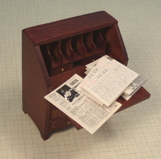 Four miniature collectible newspapers, The Antique Trader dated, 1958, San Franscisco Evening News, both of which are readable with a magnifying glass and 2 faux newspapers entitled Extra News Extra, with text that is not readable. Perfect for the 1" scale dollhouse. Sizes are (in order of listed here): 1 1/4" x 1 3/4" folded; 1 1/2" x 1 7/8"; 1" x 1/2" each. All 4 are in nice condition. Pictured on top of a 1" scale Lynnfield Furniture Governor Winthrop desk (sold separately).
