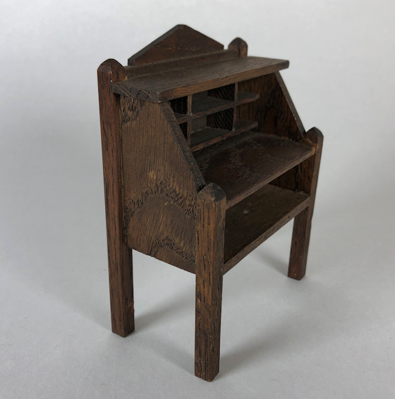 Hard to find classic Craftsman Style desk made during the Craftsman period, c. 1910-15. This is a high desk, with numerous cubbies and a writing surface with an open space underneath. Straight legs which come up and end in blunt points and a triangular shaped backing complete the Craftsman design. The surface is surprisingly smooth when a finger is run across. Really nice condition with no breaks or repairs. 4 1/8" high at sides and 3 1/2" wide. There is a tiny remnant of an aged paper label on the back. Early period dollhouse furniture is getting harder and harder to find, especially from the Craftsman era.