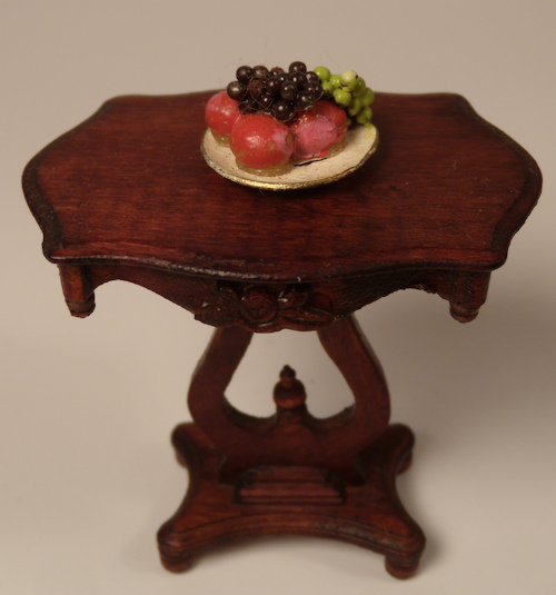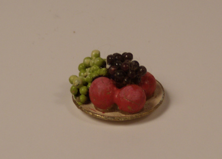 This is a lovely grouping of composition fruit beautifully arranged on a metal plate made by the firm of Dolly Dear from Tennessee c. 1940. The plate is enameled in a cream color and edged in gold. The fruit includes 2 bunches of green and red grapes and 4 red apples artistically arranged. Also pictured on a Carl Forslund Cherry Lee Occasional Table (table sold separately) to illustrate how attractively this fruit grouping can be displayed. Nice condition with minimal aging. Diameter of plate is approximately 1" across.