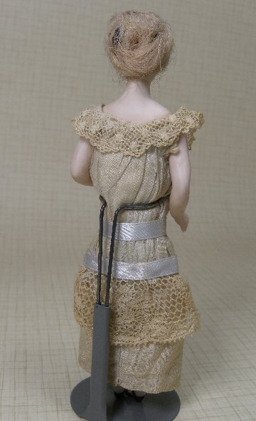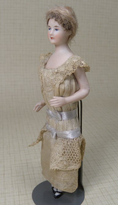 What a lovely lady doll with a splendid white Edwardian style dress trimmed with lace made by the German firm of Kestner, c. 1905-10 period. She is unusual for a number of reasons. Her bisque shoulder plate comes down deep and her arms are all bisque and jointed, attached to the deep shoulder plate. Also she has a light blond wig with a swept up hairdo with braiding on the top front. She has a sweet, delicately painted face with a serene expression. Long slender neck and beautiful delicate hands. She is 5 3/4" high. Her body is cloth and she has molded 1 strap shoes with low heels. Beautiful condition with no breaks, repairs or hairlines. There is a little bit of thinnning on her hair in the back which can be seen in the photo.