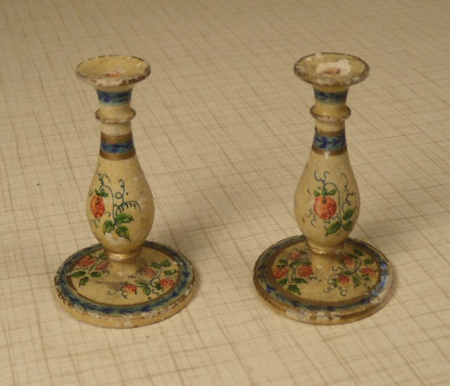 This is, by far, one of the loveliest German treenware items I have ever come across. Wooden pair of candlesticks, hand painted with red strawberries, green leaves and vines and accented with blue and gold stripes over a background of lovely cream color. Beautifully made and extremely rare, the strawberries design is one of the most desirable patterns in treenware. Height is 2". An example of this item is pictured in Swantje Koelher's Christian Hacker book on page 314. Also pictured on a 13" high American dresser with a 13" high china head lady for size comparison and to show how lovely they all look together--all items are sold separately. This is a very rare and wonderful set of treenware candlesticks.