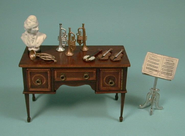 Pictured are 4 wind instruments, 2 horns enameled in gold, 1 horn enameled in silver with black accents, and a french horn enameled in gold. All 4 pieces are being sold together. Made from metal, c. 1940 made by Dolly Dear. Also pictured with other musical items, sold separately. Each is approximately 1 1/2" long. No moving parts.