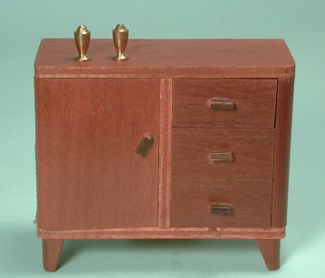 Small, solid brass salt & pepper shakers in 1" scale, pictured on a Moderne cabinet (sold separately). Great accessory for a sideboard or a dining or kitchen table. American-made either in the late 1940's or early 1950's. These represent salt & pepper shakers and do not have holes on the tops. Height of each is 1/2". Nice patina.