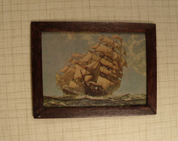 Wonderful dollhouse picture of two schooners side by side with blue sky, wispy white clouds, and deep green ocean waves. Nicely made stained, wooden frame, mitred at the corners. Print is from a classical oil painting. Size is 3 1/4" long by 2 1/2" high, perfect for the 1" scale dollhouse, which would look great over a fireplace mantel or other open wall. Great condition. Needs a little sticky on the back to hang.