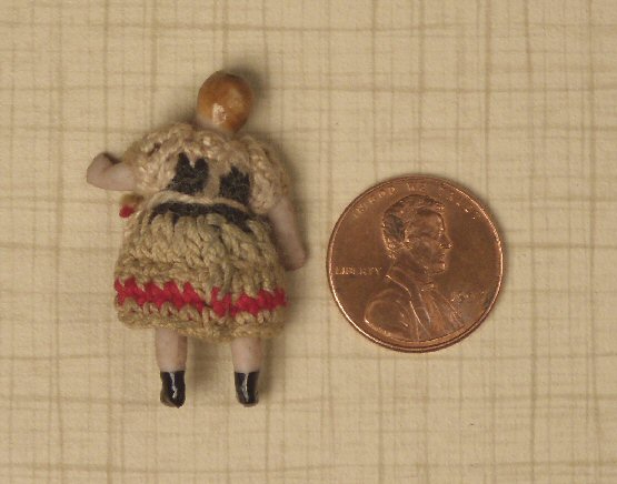 Tiny all bisque girl made by the German firm of Carl Horn, c. 1910. She wears her darling little original crocheted dress. She would be perfect in a tiny dollhouse or as a doll for a child dollhouse doll or for a dollhouse nursery. She is jointed at the arms and legs. Features are painted. She is 1 7/8" high. Also pictured with a Carl Horn tiny boy (sold separately) for size comparison. Great condition with no breaks or repairs.