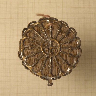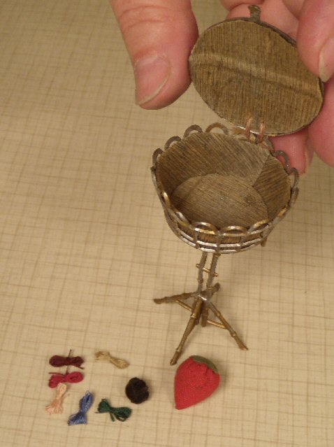 Lovely soft metal sewing stand gilt in gold made by the well-known German firm of Gerlach. The top portion has a lovely design, which is shown separately, and the legs and center double pedestal are faux bamboo shapes. The top opens up revealing the beautiful original crepe lining inside. The accessories which come with the sewing stand include numerous tied silk threads in lovely colors, a ball of black yarn and a sweet pin cushion in the shape of a red strawberry with green leaf top stuffed with what feels like crushed nutshells. This is a lovely and rare set. c. 1900. Height is 3". Very nice condition with some wear to the gold gilt.